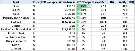 As I have noted previously, the Brazilian stock market has a fraction of the liquidity of Nvidia. Silver and gold have more liquidity, but that is because prices have skyrocketed recently (prices are as of Thursday). While both Nvidia and the Hungarian forint are up this year, the forint is up more because 9 million people live in Hungary and 330 million people live in the US, and if a small amount of capital leaks out of Nvidia, it is a lot of capital for Hungary to absorb. Prices adjust. Similarly, while gold was up a cool 24% this month before plunging around 10%, there isn’t much of it to trade. Most of it is held in vaults.