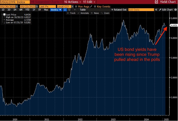 Government constraints. While the US is at the epicenter of the AI boom, the government faces significant constraints—a 6% budget deficit, above-target inflation, and a narrow Republican majority in Congress. If Trump cuts taxes, the bond market can sell off, crushing the stock market, and weakening the economy, meaning a tax cut can backfire. Similarly, internationally, he has less leverage than it appears. He wants to push Putin to a peace deal, but the US does little business with Russia. The US is about a $30 trillion economy and imports about $15 billion from Russia. The only real leverage he could exert would be significantly increasing US defense spending and shipping more arms and even advisors to Ukraine, which he is loath to do because of the deficit and his aversion to foreign conflicts. Note that yields on US bonds (and global bonds) have been rising since Trump pulled ahead in the polls.