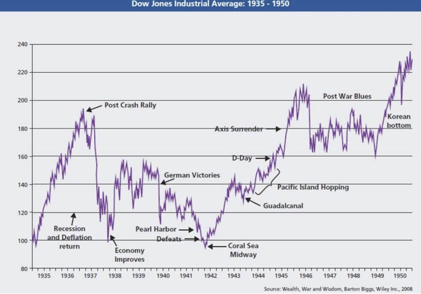 Valuation metrics like price-to-earnings ratios were less reliable than sentiment about whether the country was winning or losing. The US stock market was the mirror opposite of Germany, with stocks getting crushed as the US struggled and the end of the bear market that began in 1929 occurring in 1942 when the US began to triumph, at the time unexpectedly, over the Japanese.