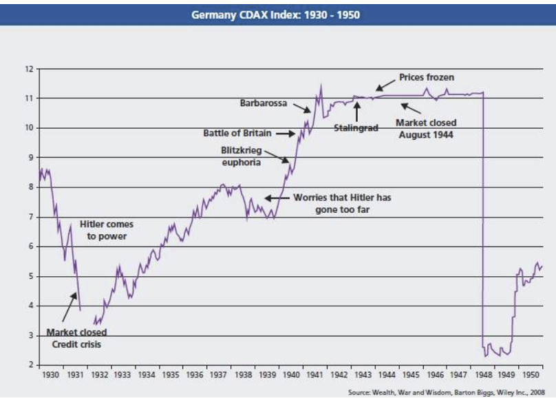 Stocks did well in fascist countries, until fascists began to lose, which took years. In Germany the key turning point was Stalingrad but before that stocks had a pretty good run. Note below that German stocks ripped higher as homicidal chaos was unleashed in Europe.