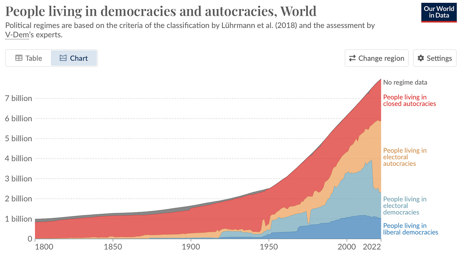Just as we have never figured out how much money to print, we have never figured out how to organize society. While more people live under democratic systems than ever before, the split between autocratic and democratic systems has been roughly the same over the last 50 years.