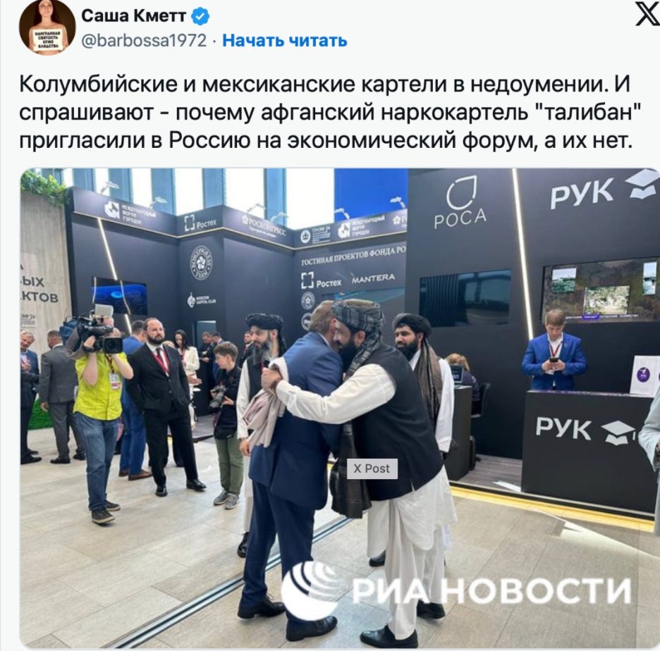 In Russia, Putin led the St. Petersburg economic forum. Seats that were once filled with the apex of Western finance are now occupied by the Taliban. Russia has become a pariah state. In the Tweet below, Sasha Kmett wrote: The Columbian and Mexican cartels are in disbelief and ask, how come the Taliban are invited to the St. Petersburg Economic Forum and we aren’t?
