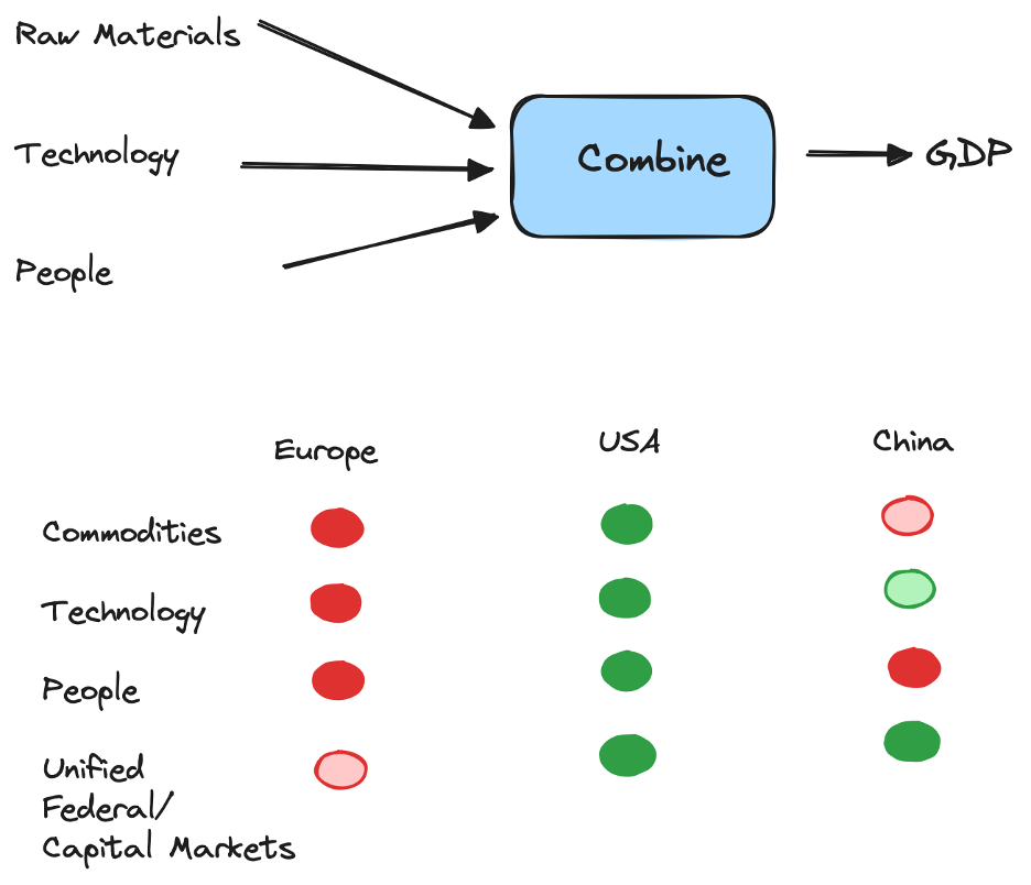 Moreover, even as Trump tests institutions, in the US there is a coherent Federal system for laws, finance, and law enforcement. Europe lacks that. The EU competes with national authorities and there is no unified European capital market (France borrows with French bonds, Germany with German, etc.). By these metrics, China compares favorably to Europe, as the diagram I created above shows.