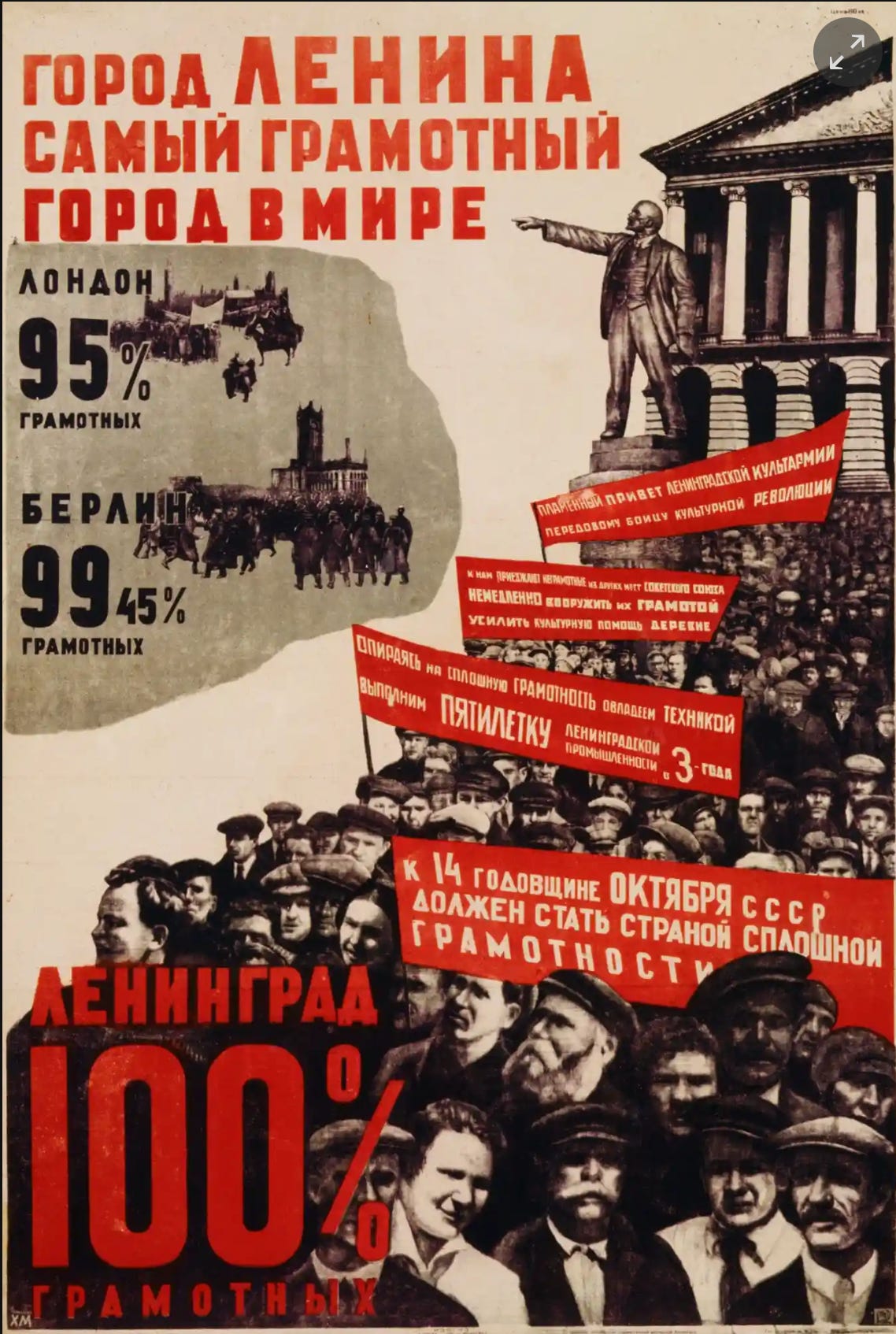 That is the backdrop against which it is best to assess Russia and China today. In China, thousands of years of rule by the emperor collapsed in 1912, followed by decades of chaotic, bloody Civil War and occupation. In Russia, the entire social structure collapsed in 1917 followed by decades of internecine murder. Each country adopted “Marxism,” which really means a) rule by a chief b) factories, electricity, immunization, literacy c) mind control. The 1932 poster below brags that the literacy rate in Leningrad was higher than in London or Berlin.