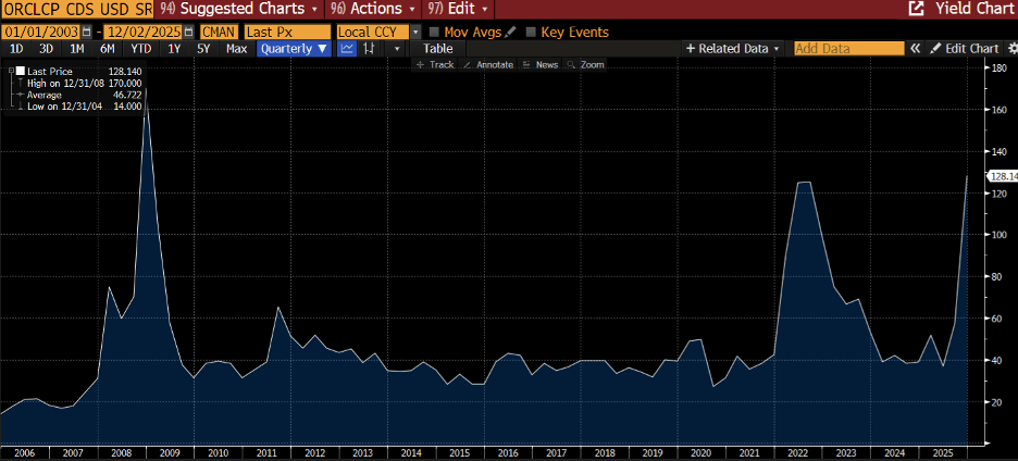 The corporate sector is earning plenty of money. The question is if the rate of change on their new spending will go up next year. The answer is…it depends how you measure it. If you look at the Mag7, the answer is “it will slow.” Meta announced Thursday they are slashing spending in the “Metaverse,” an indication the strain of funding AI capex is impacting even the strongest balance sheets. There are anywhere between 500 and 1500 data centers getting built (depending on how you measure) so measuring the aggregate rate of spend is involved. We know the cost of capital for this spending is increasing. The risk of default on one of the key nodes in this universe, Oracle (shown below), is at its highest level since 2008. In other words, the market does not think their spending will work and/or this has become a proxy to short the private company OpenAI.