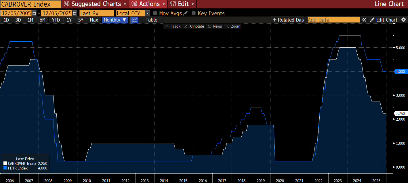 The market believes we will get a “hawkish” cut next week. Literally every bank report I’ve read says this. It is an “insurance cut,” they assert. When we got such pivots from the Bank of Canada and the European Central Bank, bonds promptly sold off and that is what many are thinking is about to happen in the US. Maybe. If I were on the Fed, I’d be more concerned about a faster slowing, declining employment. If the labor market does begin to wobble more, it would certainly not be, in retrospect, a surprise. We’ve had erratic government policy all year, policy that is so erratic the Fed has not been able to properly calibrate, first due to tariffs then due to the shutdown and lack of data. As a result, the Fed has gone slow while other central banks have moved faster, leading to a gradual erosion of economic activity. For instance, US policy rates are 4%, while they are 2.25% in Canada and 2% in Europe. Both the US and Canada jacked rates up to deal with Covid inflation, but in Canada they brought them back down while in the US they have not. Now there are signs of a rebound in Canadian hiring, which is how it is supposed to work.