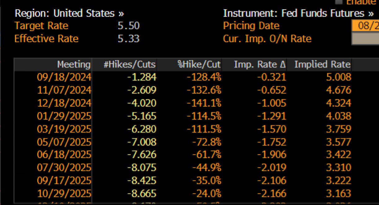 To be sure, the Fed themselves don’t know what they will do on September 18. Likley some of them are thinking “let’s wait for the employment data on September 6. If it’s strong (as it is supposed to be) let’s cut 25. If it’s weak, then we can consider 50.” But if you listen carefully to what they are saying, they are correctly identifying the dominant risk has shifted to weaker employment from strong growth. Data is always mixed, but there is enough of it to suggest the fear of higher unemployment is well-placed. My north star in this episode has been short-term real interest rates. At 5.3%, if inflation is around 2%, that’s a 3% real rate which is too high to allow strong economic growth. Once that is recognized and the impacts (softer employment) are clear, cut and cut quickly. This, as I have shown above, is not discounted; a 32 basis point cut is discounted.