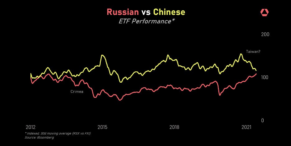 If Xi invades Taiwan, it will mark a definite additional step toward isolation. Foreign direct investment will likely slow, institutional investors will back away from Chinese capital markets and China’s integration with the rest of the world will ebb, as it has many times over its long history. Based on examples in the US and Russia, this impact is perhaps around 20 to 60 basis points of GDP growth a year, or $600-$700 billion of Chinese GDP over the next decade. It doesn’t seem like a great bet, but then again, Crimea and Iraq fail the same test.