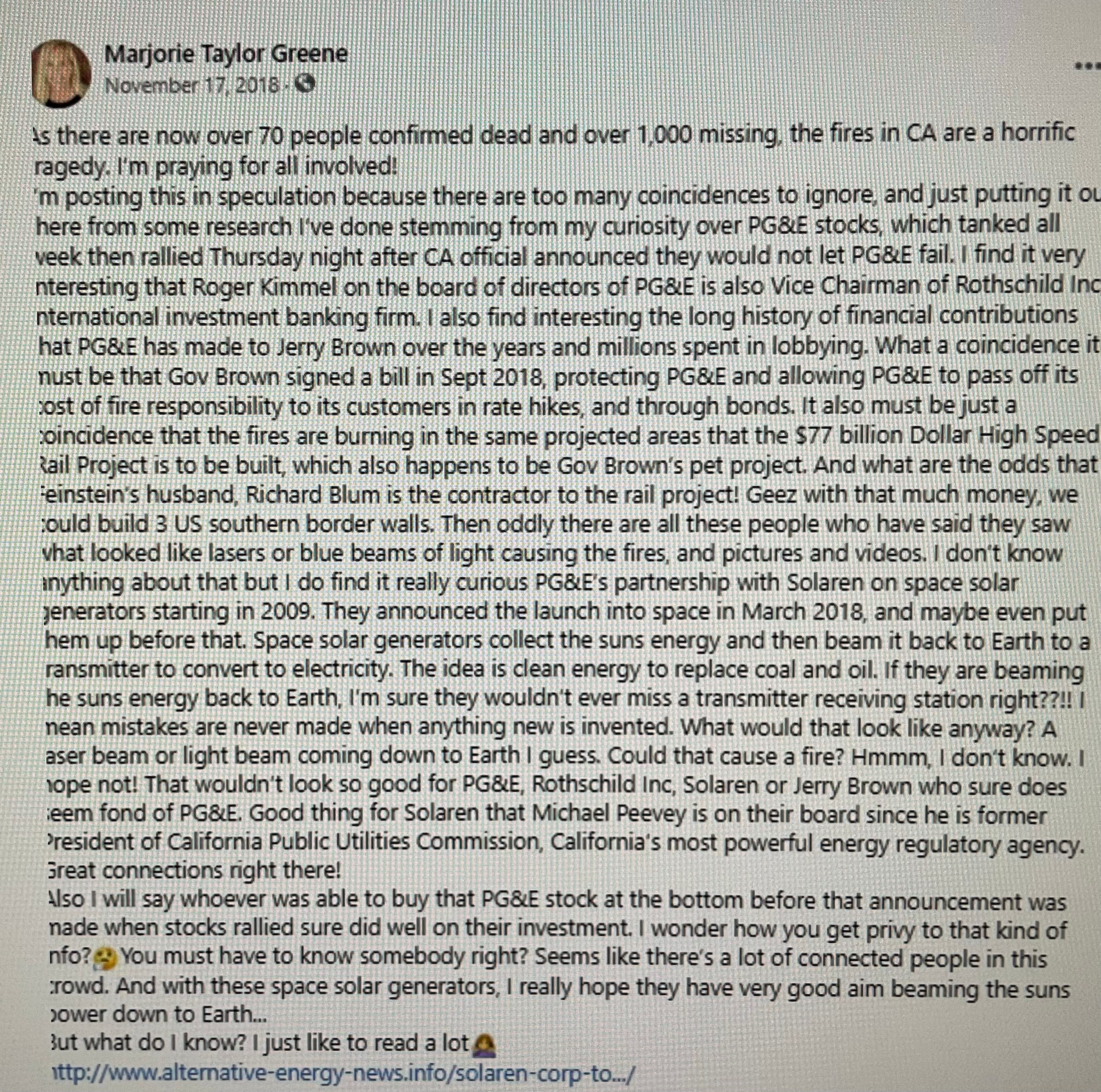A New York Times profile said Green asserted “a wildfire in California … was ignited by a laser beam shot from space by a prominent Jewish family, the Rothschilds.” It sounded so bizarre (I’m revealing my data-centric bias!), I looked into it. As far as I can tell, the New York Times is referring to Green Facebook post, below.
