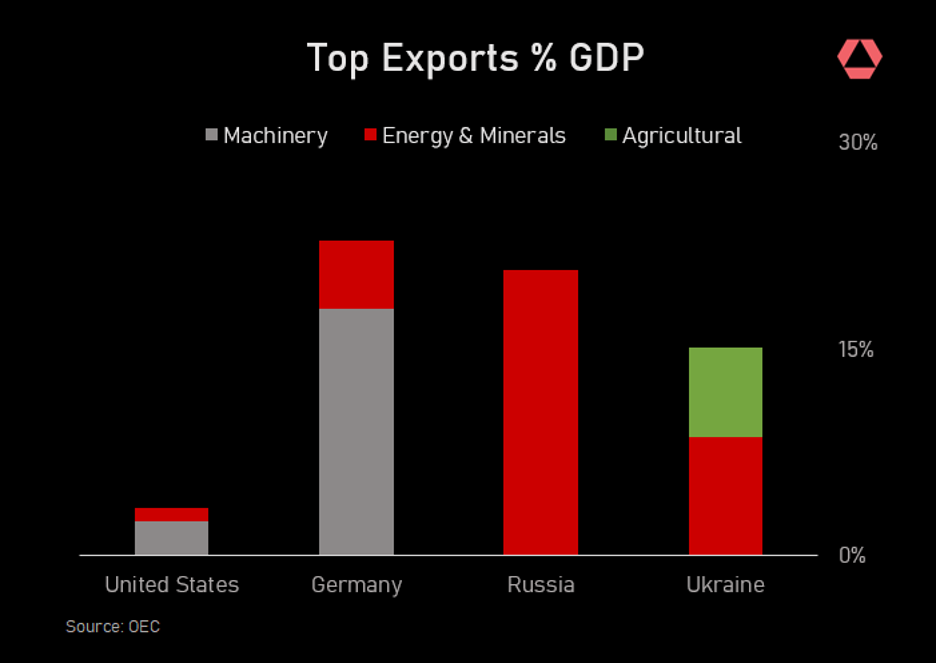 The charts below illustrate the above. (Rose Technology, an incredible data-visualization start-up, makes them). Russia exports oil, Germany uses that to build machinery. Ukraine exports more agricultural goods and oil products. For the US, trade is simply less important.