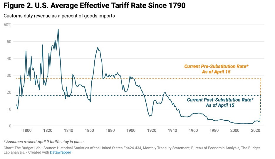 Tariffs are high. How high is complex due to all the shifts, delays, and exceptions, but this chart from the Yale Budget Lab is a good place to start. This changes by the day. As I write this, there is a report that the Chinese have a list of U.S. exemptions, meaning they are shifting tactics even though they appear not to be. High tariffs and erratic policy will likely impair capital spending and hiring, which should slow global growth, as will deportations and slower immigration. Backing off extreme tariffs will lower inflation risks, giving the Fed more room to cut, which supports asset prices. The talk today is of trucking and freight companies seeing an abrupt slowing in activity, which, given the pattern, suggests yet another shift in White House tactics is coming.