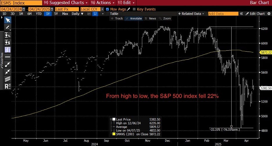 Twice close to the edge. A new US Administration took over about 100 days ago and implemented radical policies that brought us close to the edge of financial collapse on both 4/7 and this past Monday, then abruptly walked these policies back. By “close to the edge,” I mean the White House had lawyers looking at their ability to fire the Fed Chair this week. Stocks were down, from top to bottom, 22% in the tariff sell-off. Lower equities = lower growth and confidence (via the wealth effect). But a stock bounce will immediately soften that blow. The stock market did what Congress and the courts failed to do: constrain the President. Recent financial policy was similar to the Jan. 6 incident—it brought us close to the edge but not over it. The more policy goes to the edge, the higher the odds we do finally go over it.