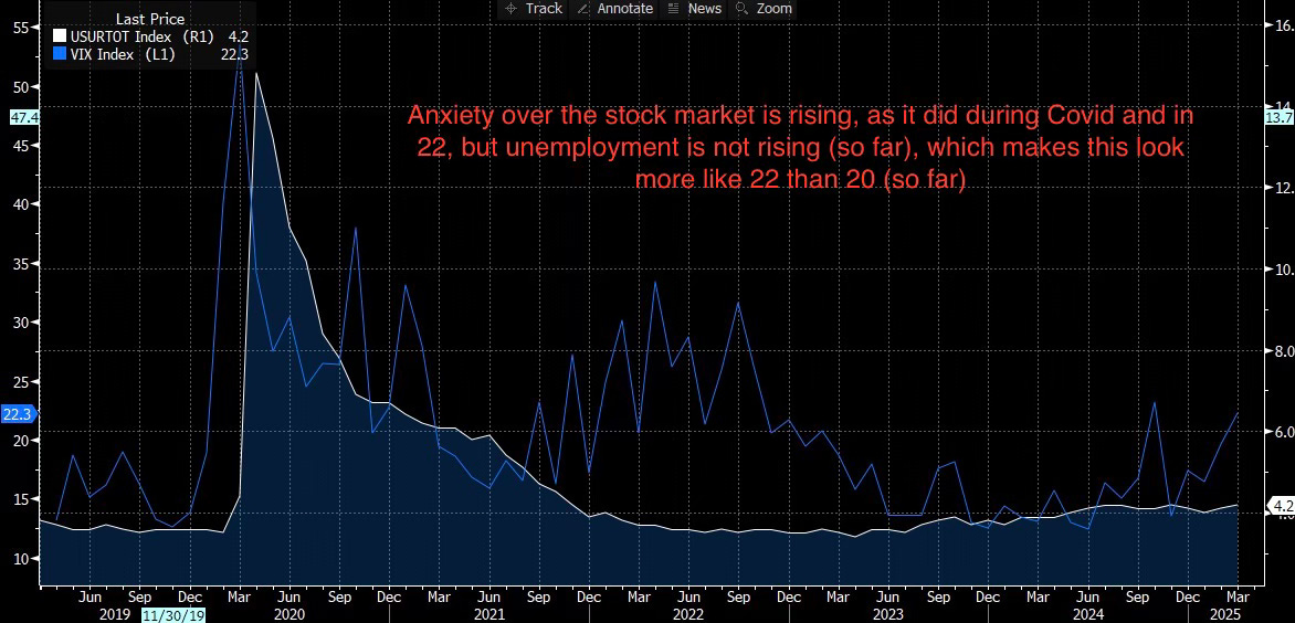 Hard data healthy. Some MAGA optimists were dismayed by how extreme the policies have been. Some MAGA skeptics were surprised by how fast the Administration pivoted away from their initial policies. We’ve had a big reaction in the asset markets, as shown above, but no measurable reaction in the real economy. Volatility on some days was as high as in 2008. Below, I show the VIX (volatility index) in blue, which measures how worried investors are about the stock market, versus the unemployment rate, which remains low. In 2020 (COVID), the rise in VIX was closely followed by rising unemployment, but in 2022 it wasn’t. This time, the volatility is caused by the whims of a single person, as opposed to a lethal virus—meaning it is much easier to bring volatility down. Policy just needs to be less extreme.
