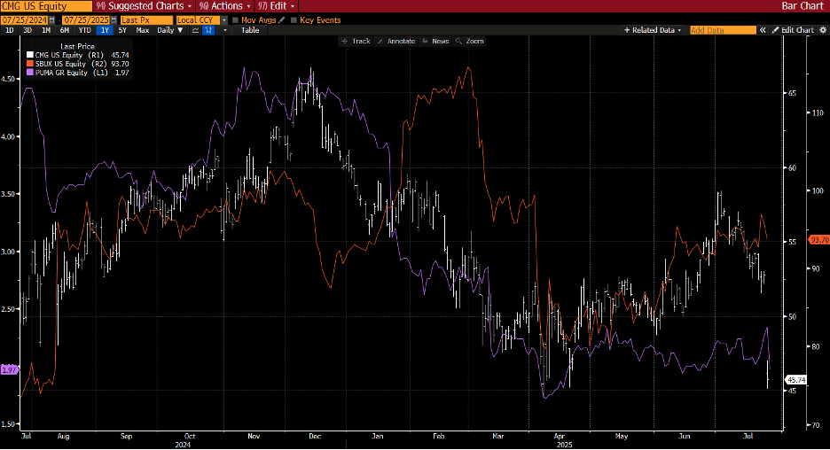 It isn’t just Chipotle—lots of consumer stocks are wobbly. Below I show Chipotle, Puma, and Nike. They are all struggling and say that the combination of tariffs disrupting their supply chains and cautious consumers is causing some pain.