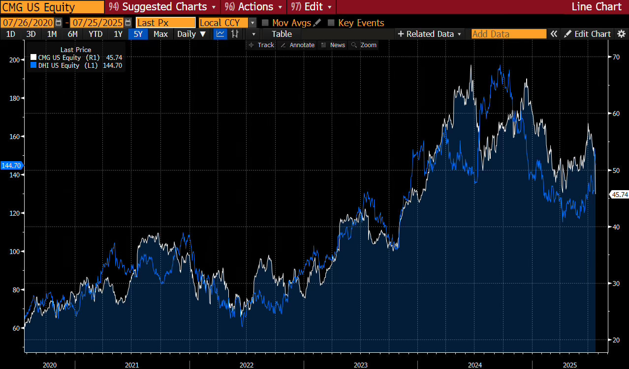 Separately, the homebuilder stocks are shooting higher, as you can see by comparing Chipotle’s stock against D.R. Horton. Homebuilders are sensitive to interest rates, so part of this rally reflects the market’s guess at what comes next—namely, weaker consumer spending, an easier Fed, lower interest rates, and a housing revival. The white line is Chipotle; the blue is D.R. Horton. They are now diverging, though they usually move together.