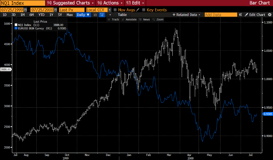 One is that U.S. employment data does weaken, but the Fed is reluctant to cut because tariffs are boosting inflation. Yield curves could flatten because bond traders may focus less on inflation and more on weak growth. The other scenario is that the Fed does ease, and U.S. stocks enter a full-fledged bubble, like in 1999–2000. That bubble pulled capital into the U.S. and drove the euro below parity. If this boom is seen as deflationary, bonds may actually rally. Below I show the euro versus the NASDAQ in 1999. The euro fell for many reasons, but one of them was the draw of U.S. capital markets. Yield curves flattened as well.